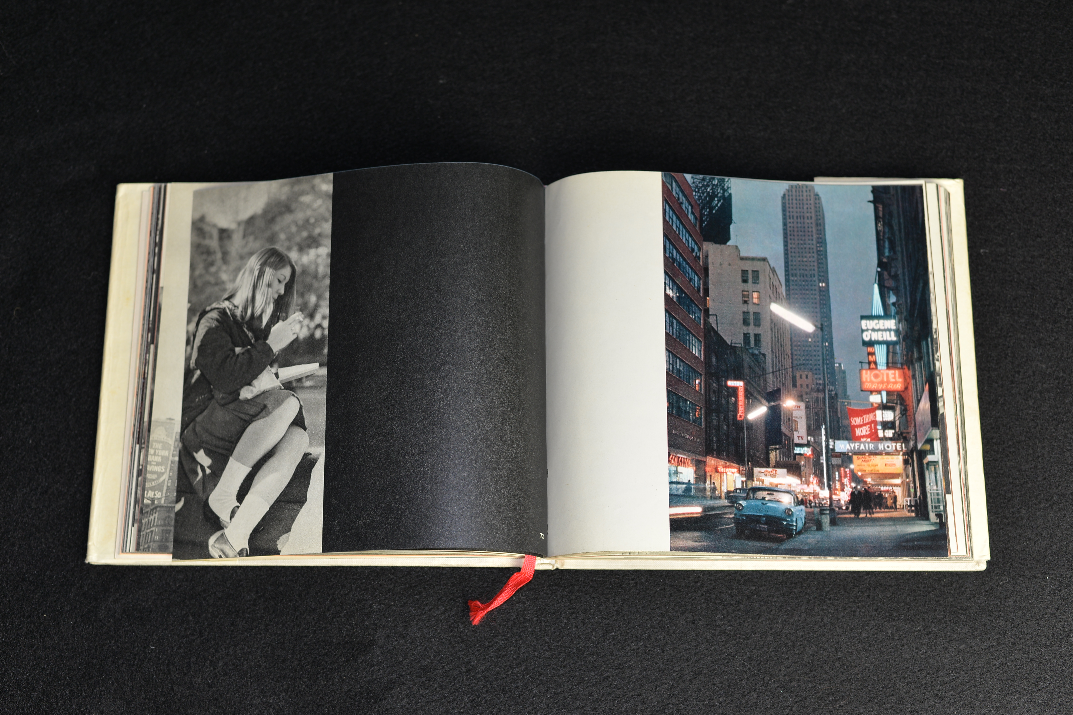The photobook itself was conceived by a graphic designer – Jaroslav Fiser – who elevated the book esthetically, despite its unflattering dust jacket. The hardcover was beautifully designed with engraved fonts and stars, using the American flag colors. The inclusion of color images throughout the pages breaks the monotony of black and white pictures, and transmits a sense of dynamism to the reader. The inclusion of movie tickets, newspaper clips, and drinks labels on some pages were also a design strategy to convey a sense of modernity and incessant flow of entertainment in NYC.