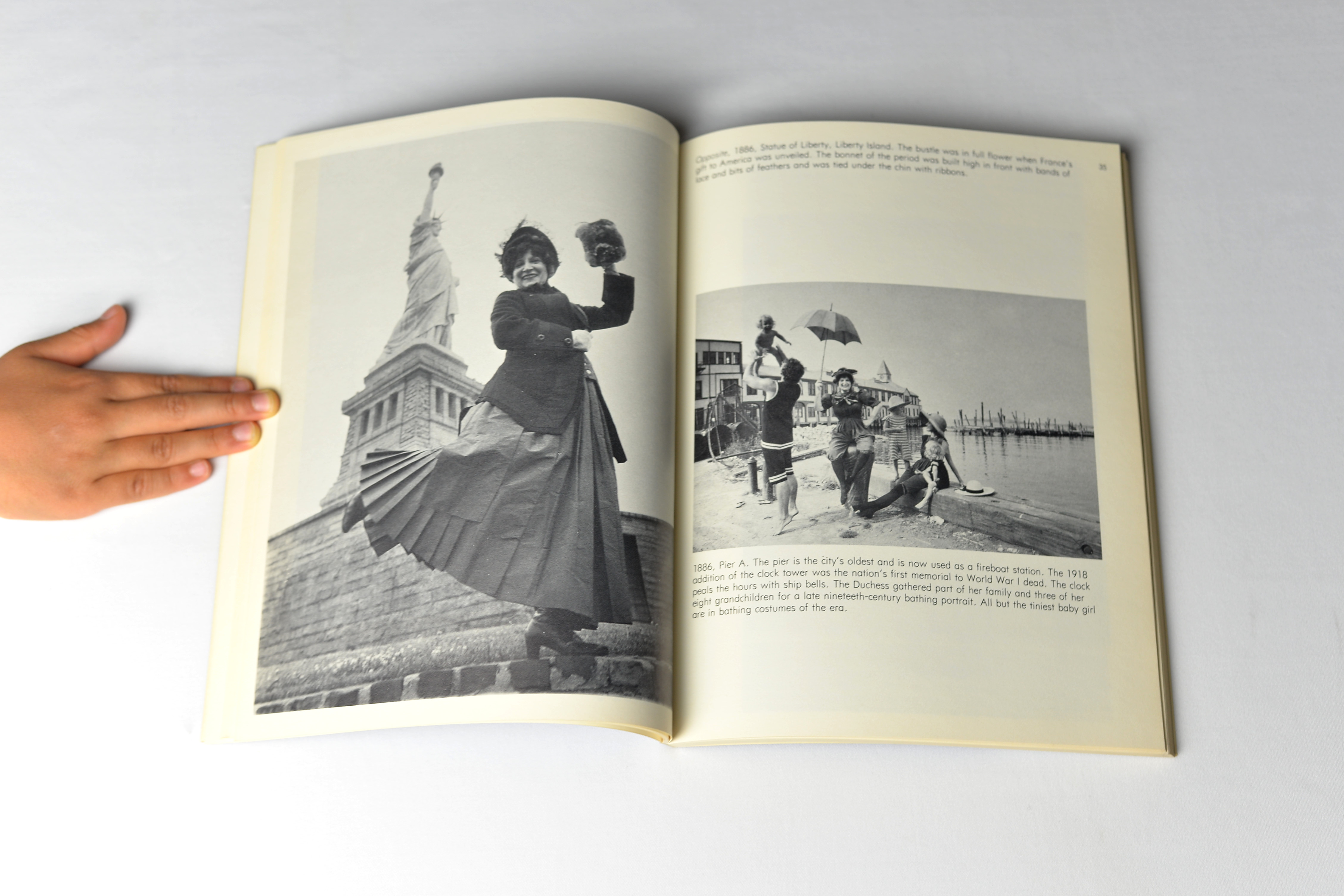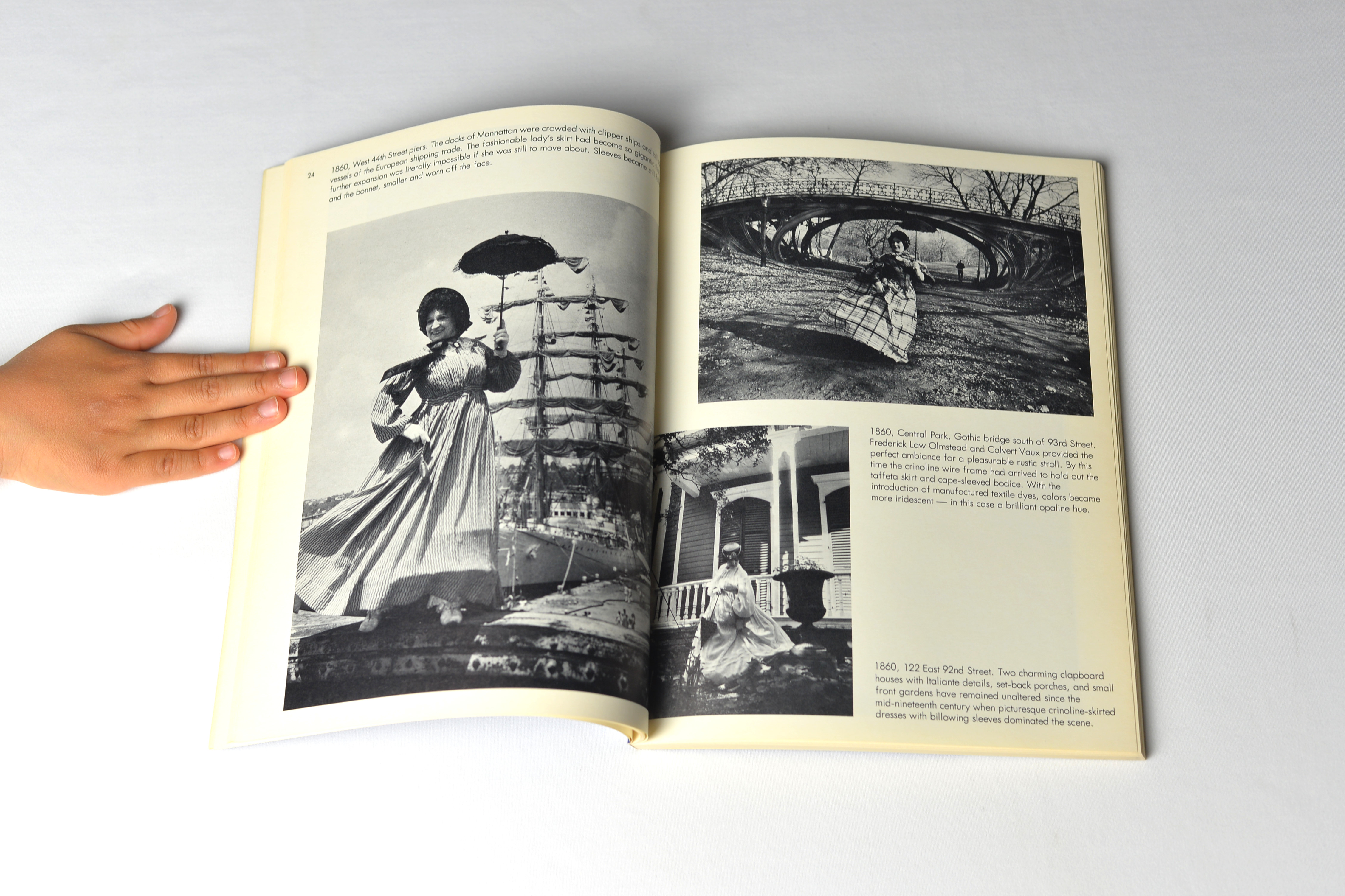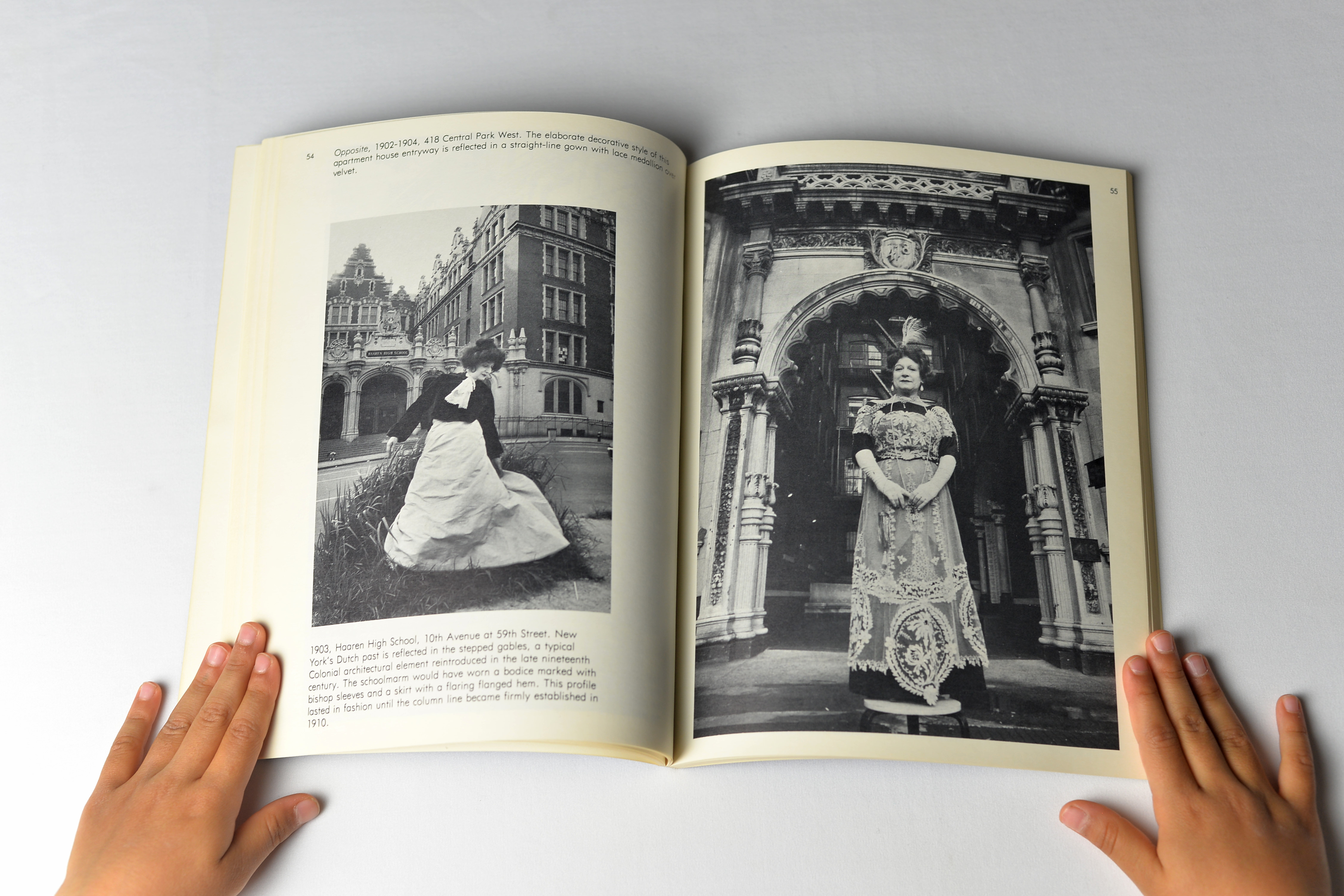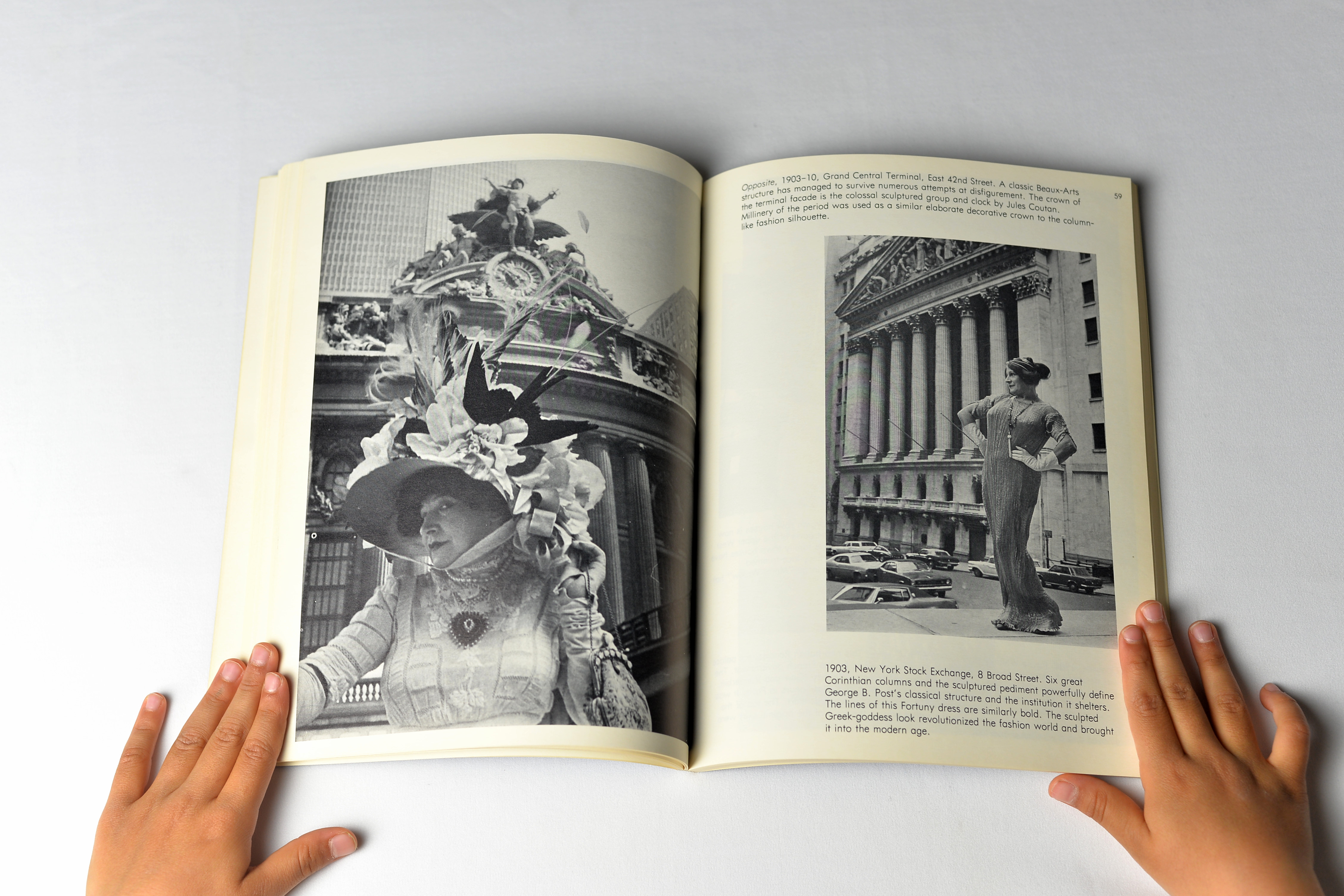 He then asked his friend Editta Sherman, “the Duchess of Carneggie Hall” to wear them and pose in front of different architectural styles, in more than 1800 locations, matching the period of the clothes. That includes Egyptian temples, Russian cathedrals, Beaux-Arts mansions, Gothic revival churches, Art Deco office buildings, and High Victorian department stores, as evidenced by the photos included in this photobook.